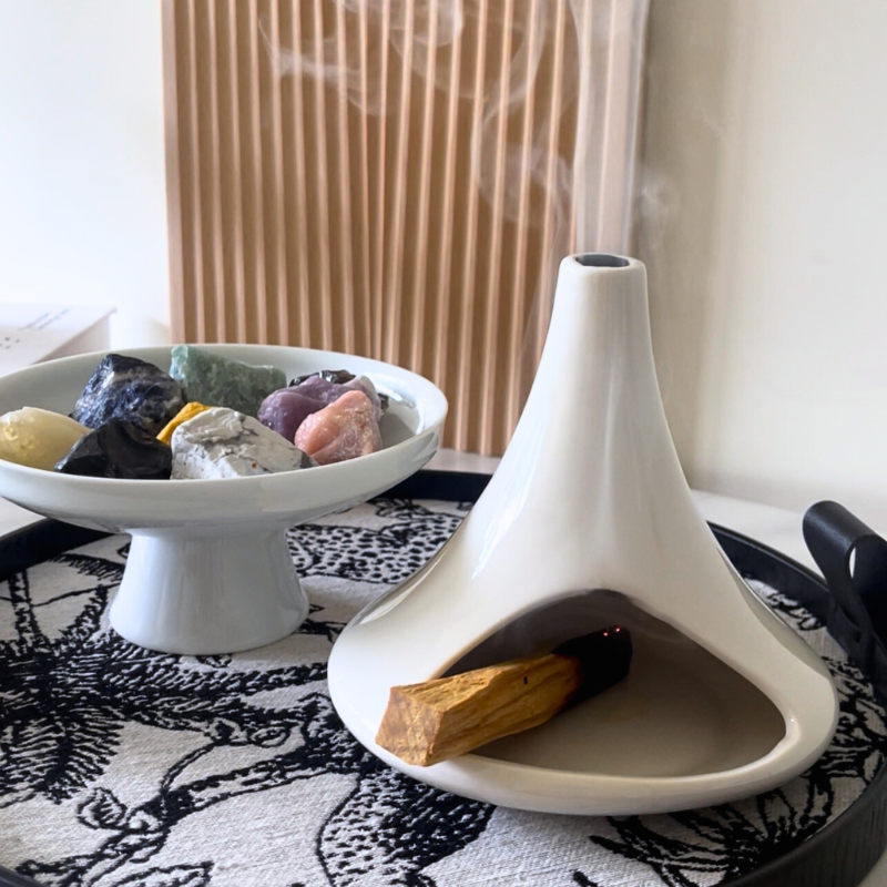 陶瓷高溫燒製的表面呈現細緻光澤,易於清潔不易殘留氣味。無論是燃燒聖木、錫蘭香枝或是小型香塔,都能自在容納。無明顯接縫與紋理,簡潔的形態適合極簡、北歐、日式或侘寂風格居家,與木質、石材、織品等天然素材並置時,更能突顯平衡的美感。
