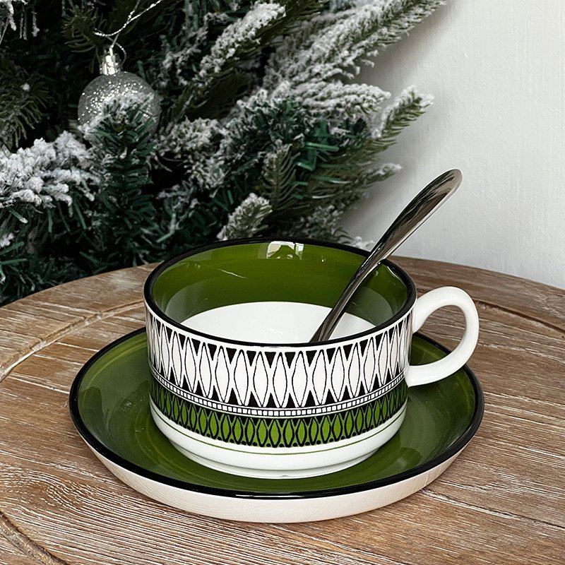 Lisbon Cup & Saucer Set feels like sitting at a seaside café in Portugal, where ocean breezes caress the glossy blue-green tiles and the afternoon sun mingles with the aroma of coffee and salt air. The geometric design echoes Lisbon’s iconic azulejo patterns, while the deep green glaze adds depth. Perfect for various hot beverages, durable and easy to clean, ideal for daily enjoyment or as a thoughtful gift.