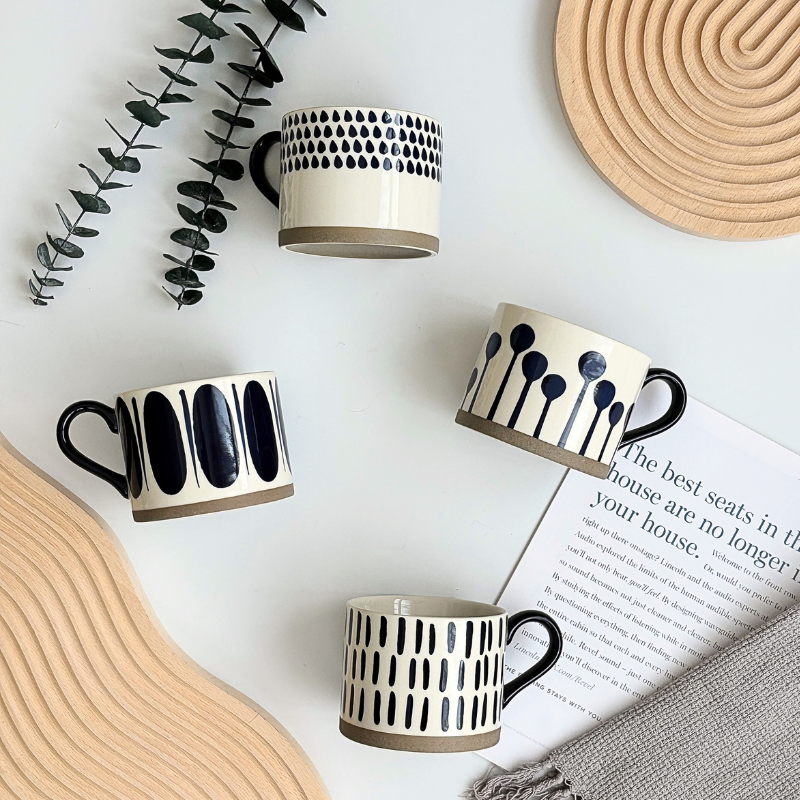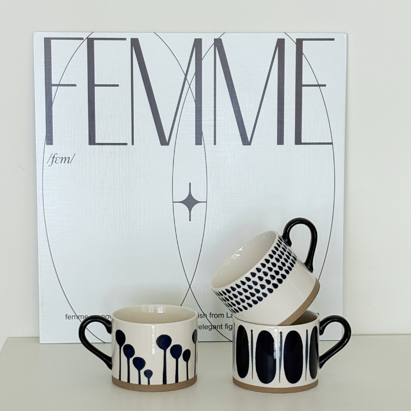 「北歐森林小曲」是一組以手繪筆觸演繹自然意象的陶瓷咖啡杯系列。設計靈感來自北歐的冬日林間:雨滴、綻放、音符、回音,在簡約的深藍與奶白之間流動。每一款紋樣都像一段短旋律,節奏輕快、色調寧靜,構成生活中最溫柔的片刻。