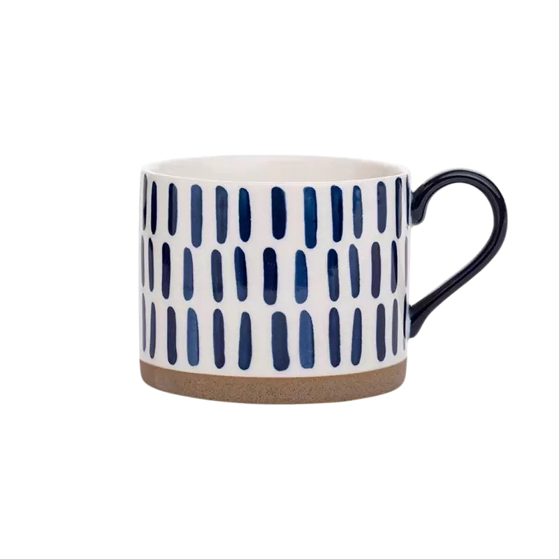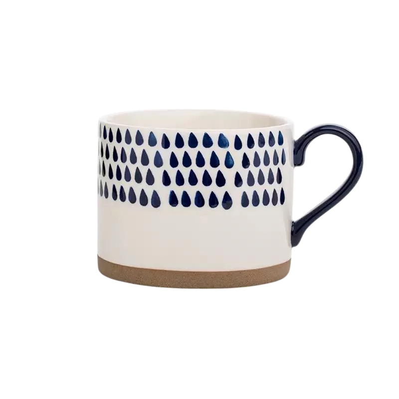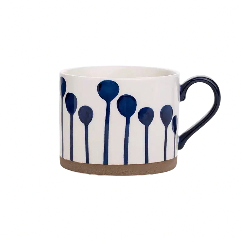 杯身採高溫陶土手工拉胚成形,保留細微的手感紋理,經透明釉層覆燒後呈現柔光質地。底部未上釉的裸陶部分呈現自然砂感,帶出一種原始、樸實的平衡之美。深藍色釉料以手繪方式上色,每一筆筆觸略有差異,正是手工器物的靈魂與溫度。