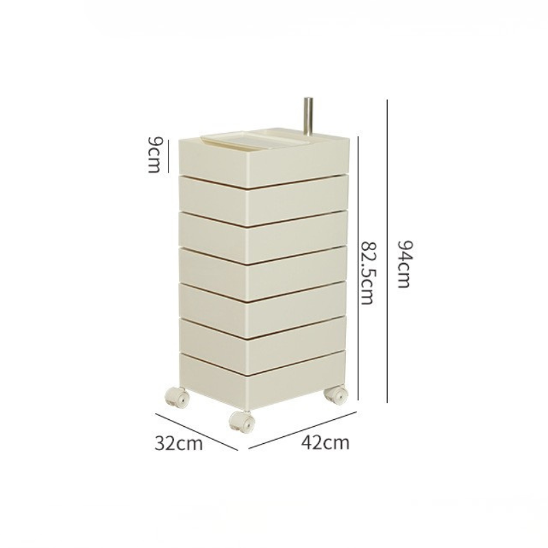 這款產品帶有的包浩斯(Bauhaus)風格與復古摩登感收納推車跳脫了傳統固定式抽屜的限制,採用了獨特的七層旋轉式開合設計。每一層抽屜都可以獨立 360 度水平旋轉,使用者不需要搬動整台車,只需輕輕一撥,就能從任何角度快速拿取內部物品。這種設計不僅增加了使用的趣味性,更大幅提升了在窄小空間中的操作靈活性。