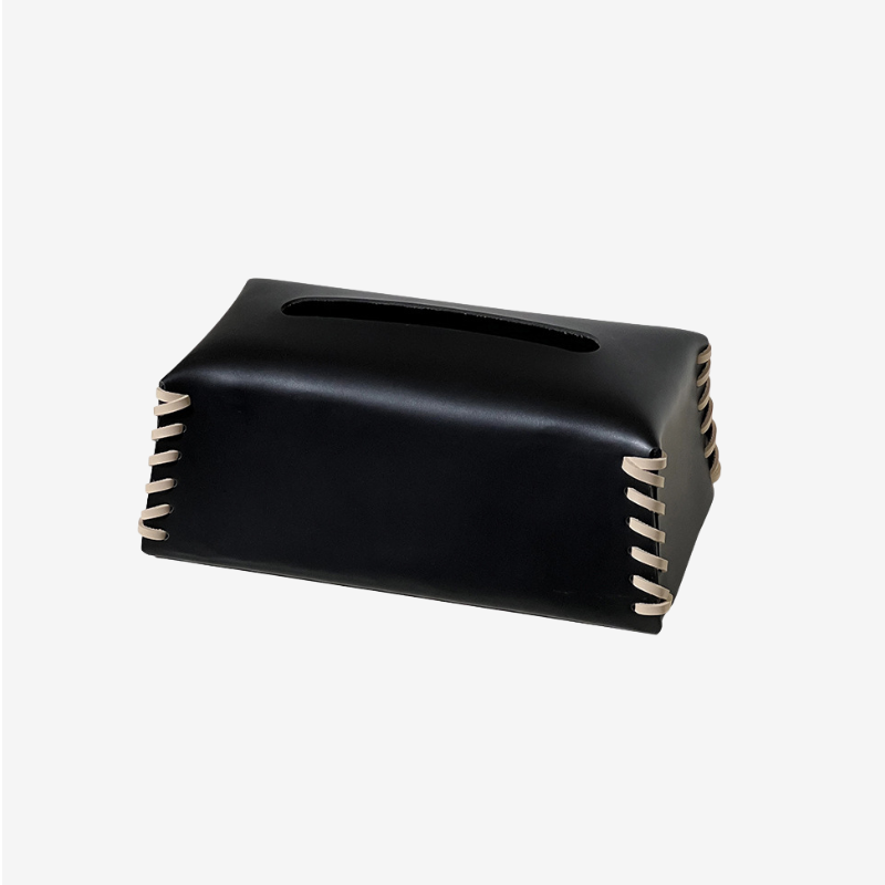 側邊以手工縫線工藝收邊,讓盒身產生微微立體弧度,不只是裝飾,更是一種結構設計,讓面紙抽取時更順手,也為極簡外型多添一點細節溫度。