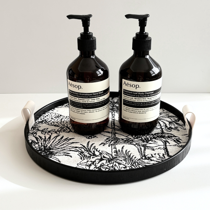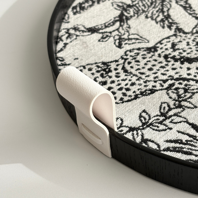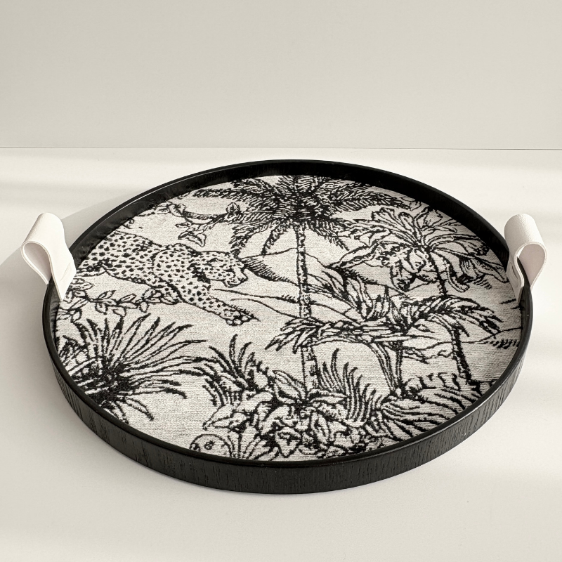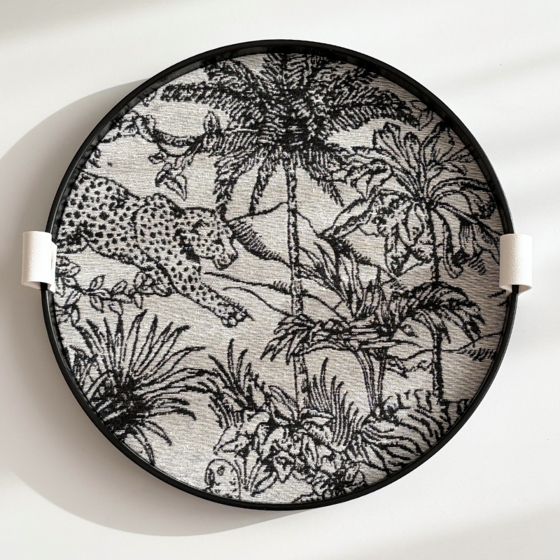 熱帶叢林黑白托盤的核心魅力,來自於其精美的緹花織物內襯。在經典的黑白配色中,一幅生動的熱帶叢林畫卷徐徐展開:目光所及,一隻矯健的花豹正低伏穿梭於枝葉之間,而一隻高貴的鸚鵡則棲息在繁茂的樹梢上,俯瞰著牠的領地。這份充滿張力的異域情調,讓托盤瞬間成為視覺焦點。