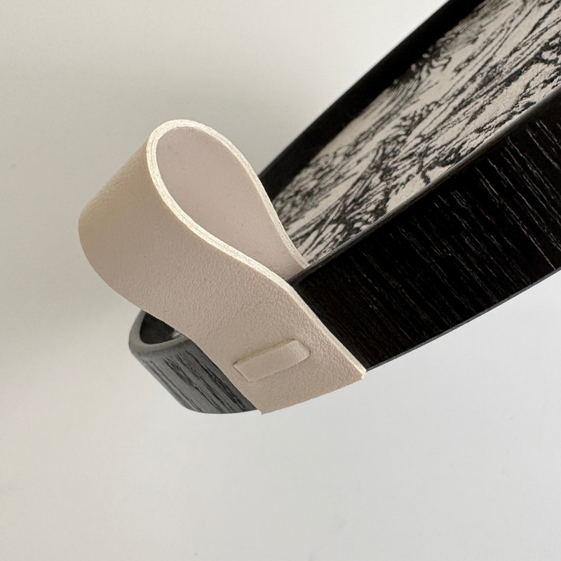 最令人愛不釋手的是兩側的提手設計。它採用了霧面黑色皮革材質,邊緣以精緻的縫線固定在外框上,呈現出優雅的弧度。皮革提手不僅提供了舒適且穩固的握感,其略帶紋理的皮質與木紋邊框形成了異材質的碰撞,在視覺和觸覺上都極大地提升了托盤的精緻度與格調。這種細節處理,讓托盤帶有幾分精品皮件的氣質。