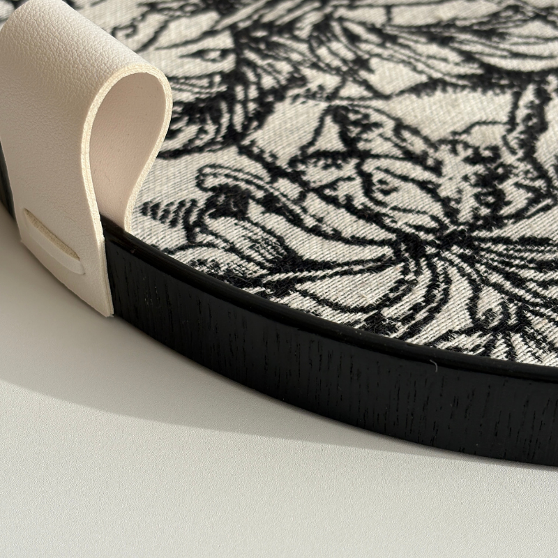 木紋與皮革的協奏 – 除了搶眼的內襯,托盤的外框與細節處理更是展現了對高品質生活的追求。外圈選用具有清晰黑色木紋的材質,這種細膩的紋理不僅增添了自然與質樸的底蘊,同時也以深沉的色調完美地襯托出內部黑白圖案的鮮明對比,讓整體視覺更加穩定且高級。