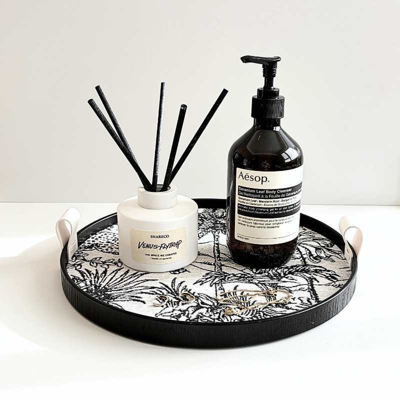 緹花工藝的運用,賦予了圖案豐富的層次感與肌理感。提花是織線交錯的方式構成圖案,觸感立體而溫暖,彷彿將一塊高級的壁毯濃縮在托盤底部。即使不放置任何物品,托盤本身就散發著一股沉靜的藝術氣息。