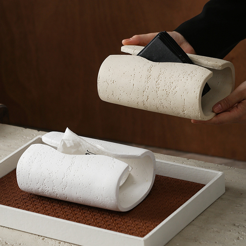 整體造型以圓弧中空結構設計,線條厚實而柔和,沒有銳利邊角,視覺上帶著安靜而穩定的重量感。上蓋輕放於盒身之上,不僅方便補充面紙,也讓整體輪廓更像一件小型雕塑,擺放時即使沒有抽紙,也依然耐看。