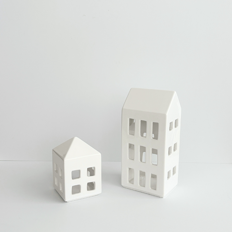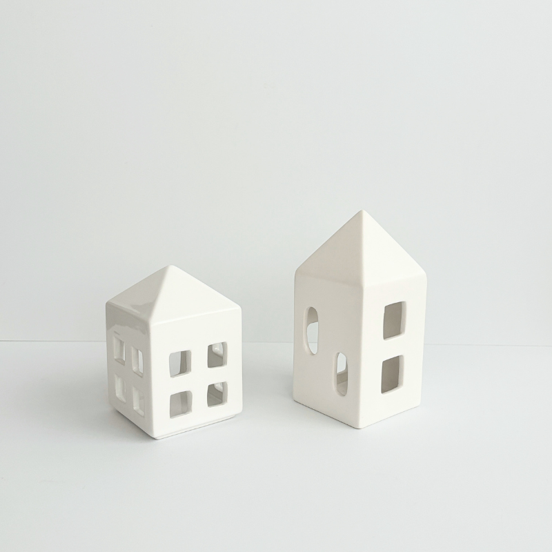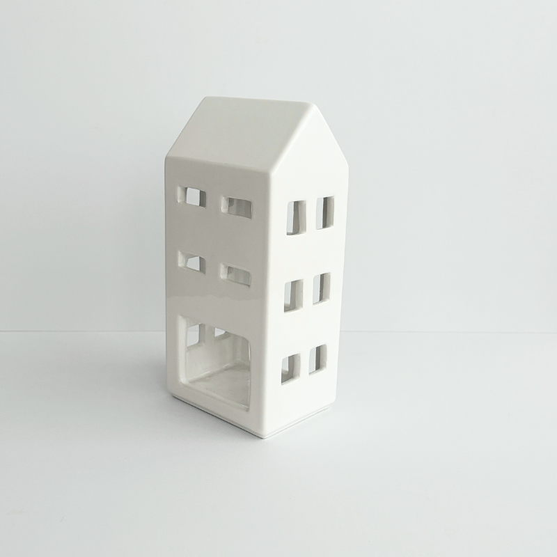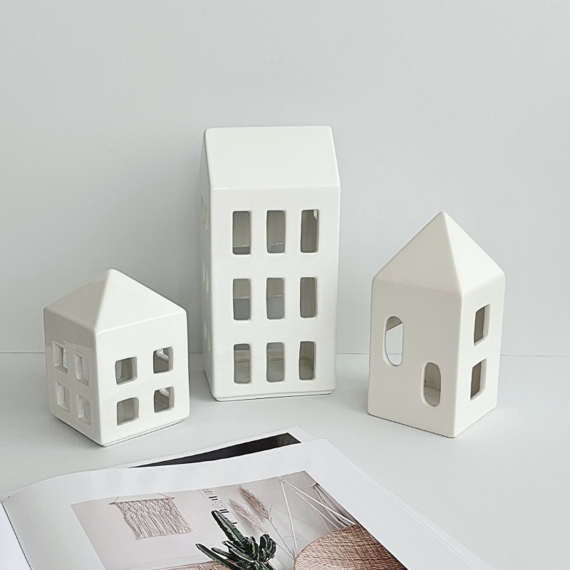 每一棟小白屋皆為手工上釉,觸感細膩溫潤,光澤柔和;底部開口可放置茶蠟或LED燈,小巧安全。無論是作為 生活儀式的微光擺飾,或作為禮物贈與,都能傳遞一份「家」的溫度與寧靜感。