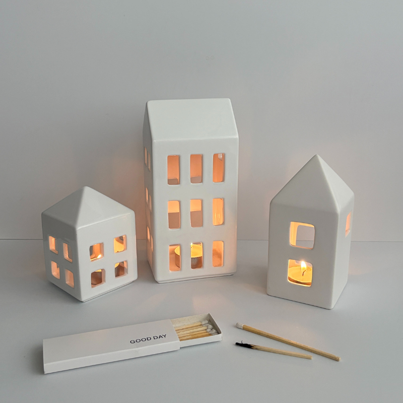 以純白無瑕的陶瓷打造,簡約的幾何屋形設計,透過開窗細節讓光線緩緩流出,宛如一座座靜默的小鎮。當夜幕降臨,點燃蠟燭,溫柔的光影從窗框中灑落,讓房間瞬間變得柔軟、平靜,彷彿時光也慢了下來。