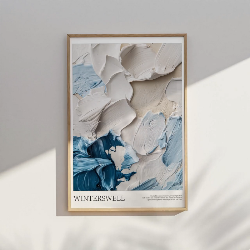 《冬潮》是一幅靜謐而富有層次的抽象藝術油畫海報。厚重筆觸交疊如冰浪翻湧,以冷白、淺灰與深海藍構築出冬日的節奏。它捕捉了寒冬中海面的流動與光影變化,既有力量,也有安靜的溫度。粗獷的肌理讓人彷彿能觸碰到風的寒意與浪的呼吸,像一場在極地之間的低語。